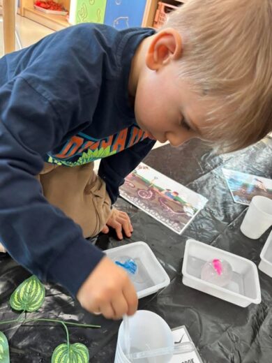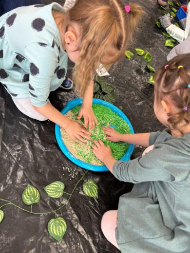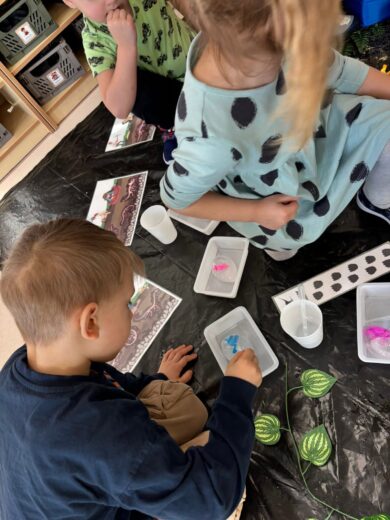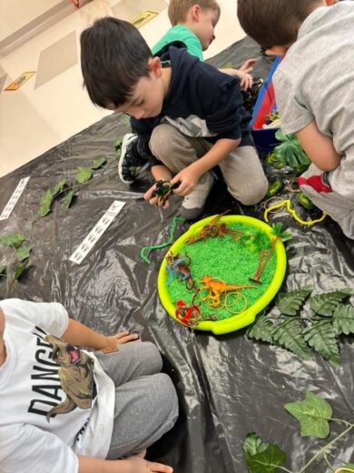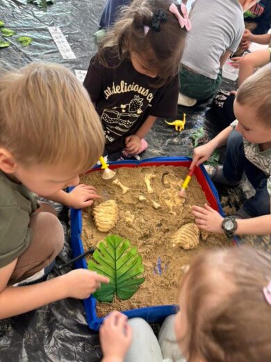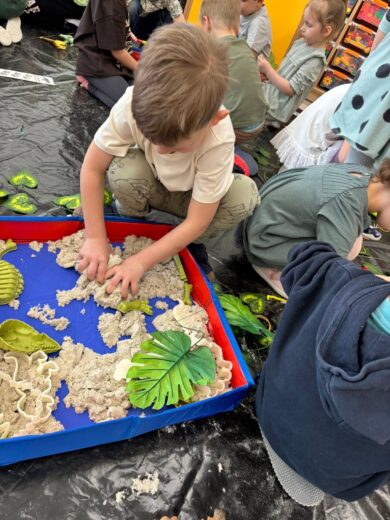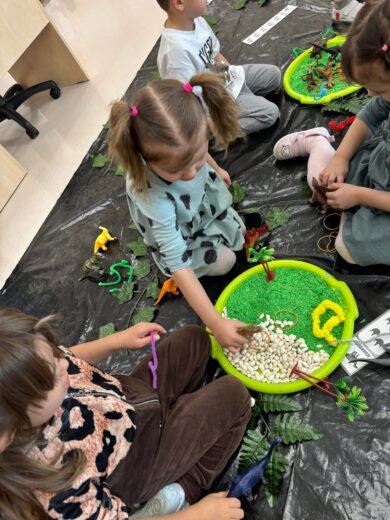 Dzieci brały udział w wielu aktywnościach związanych z dinozaurami. Podczas zajęć sensorycznych odkrywały zamrożone jaja z dinozaurami, a także wcielały się w małych paleontologów, odszukując kości ukryte w piasku. Dużo radości sprawiła również zabawa z ciastoliną, podczas której powstawały dinozaury i ich ślady.