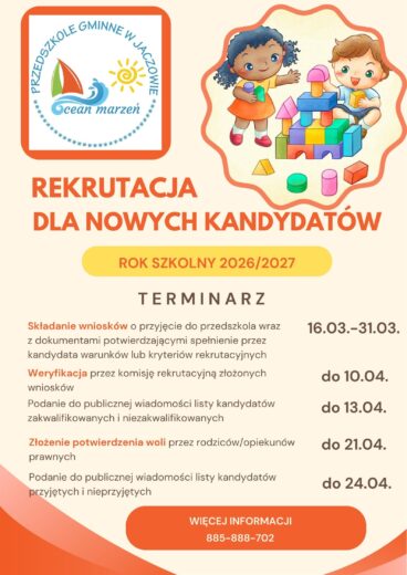 Od 16 marca rusza nabór nowych kandydatów do Przedszkola Gminnego „Ocean Marzeń” w Jaczowie.