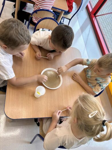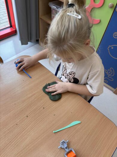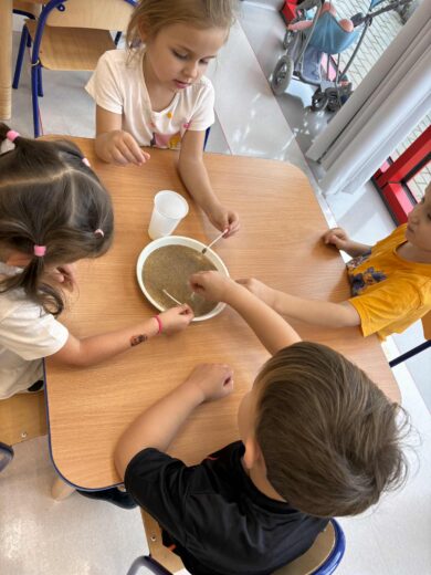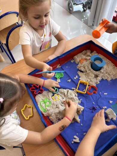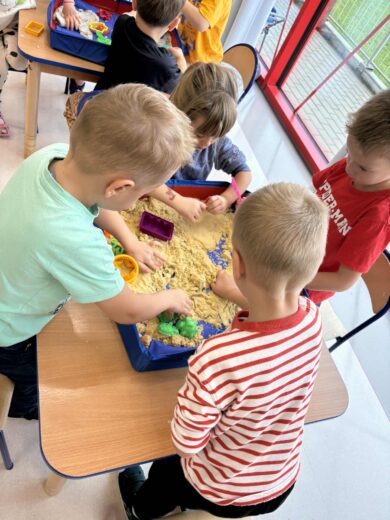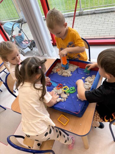 Zabawy piaskiem kinetycznym i ciastoliną.