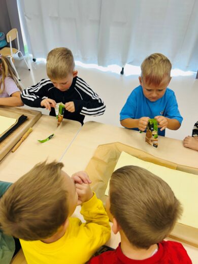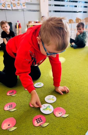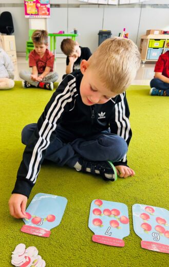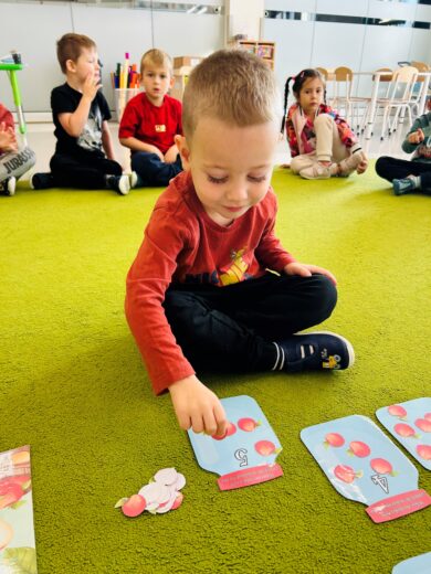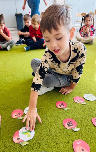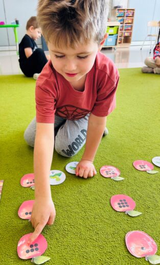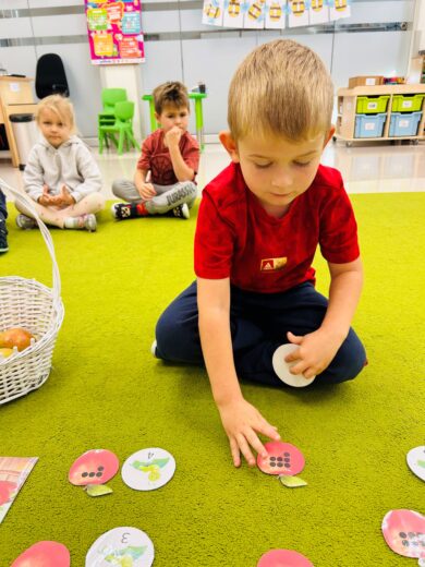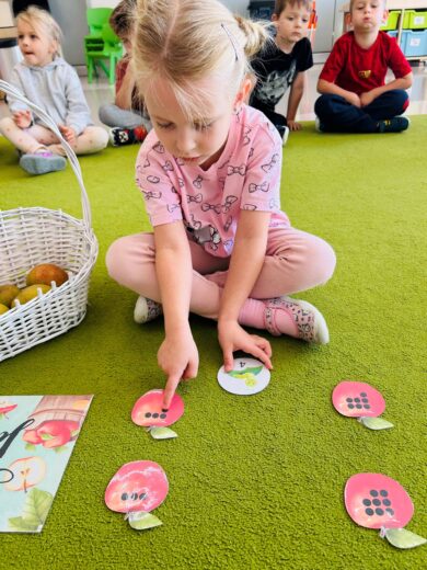 Nie zabrakło również aktywności edukacyjnych – dzieci z zapałem brały udział w zabawach matematycznych z liczeniem jabłek, ćwicząc przy tym spostrzegawczość i umiejętności liczenia. Wspólnie nauczyliśmy się też matematycznej zabawy paluszkowe „Pięć rumianych jabłuszek”.